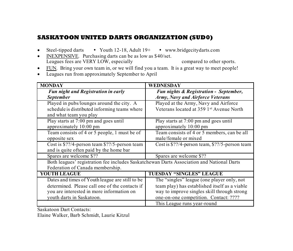 Bridge City Darts is the official online home to Saskatoon United Darts Organization. Everyone is welcome to join.